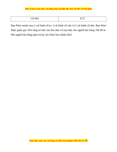 Bài 5. (1,0 điểm) Một cửa hàng pizza niêm yết giá tiền như sau: Bánh pizza Giá tiền (đô la) Cỡ to 11,5 Cỡ vừa 9,5