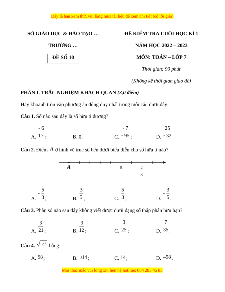 NĂM HỌC 2022 – 2023 ĐỀ SỐ 10 MÔN: TOÁN – LỚP 7 Thời gian: 90 phút