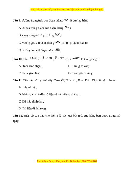 D. vuông góc với đoạn thẳng . Câu 10. Cho có , . Hỏi là tam giác gì? A. Tam giác nhọn; B. Tam giác cân; C. Tam giác đều; D. Tam giác vuông.