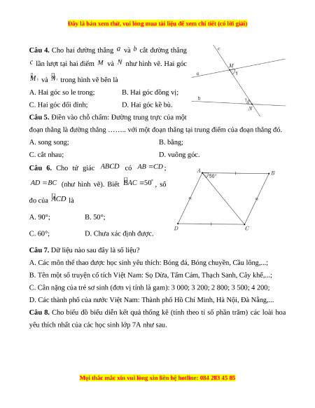 đoạn thẳng là đường thẳng …….. với một đoạn thẳng tại trung điểm của đoạn thẳng đó. A. song song; B. bằng; C. cắt nhau; D. vuông góc. Câu 6. Cho tứ giác có ; (như hình vẽ). Biết , số đo của là A. 90°; B. 50°; C. 60°;