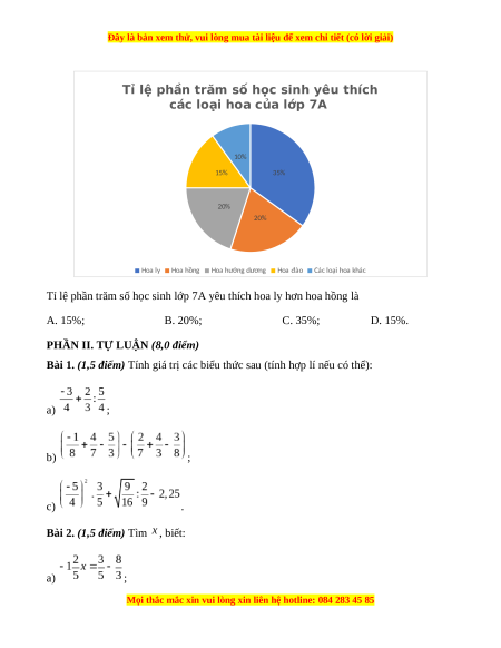 Tỉ lệ phần trăm số học sinh lớp 7A yêu thích hoa ly hơn hoa hồng là A. 15%; B. 20%; C. 35%; D. 15%.