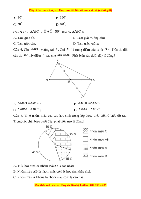 A. ; B. ; C. ; D. . Câu 5. Cho có . Khi đó là A. Tam giác đều; B. Tam giác vuông cân; C. Tam giác cân; D. Tam giác vuông. Câu 6. Cho vuông tại . Gọi