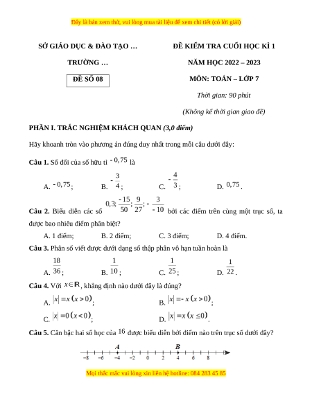 NĂM HỌC 2022 – 2023 ĐỀ SỐ 08 MÔN: TOÁN – LỚP 7 Thời gian: 90 phút