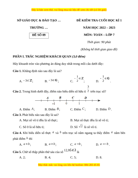 NĂM HỌC 2022 – 2023 ĐỀ SỐ 09 MÔN: TOÁN – LỚP 7 Thời gian: 90 phút