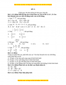 hãy khoanh tròn các chữ cái đứng trước câu trả lời đúng. 1. Tính . Kết quả bằng 2. Tính , kết quả bằng: 3. Tính , kết quả bằng: 4. Rút gọn , kết quả bằng: A. – 5xy B. – 5xy2 C. 5x2y D. – 5x2y2 5. Tính , kết quả bằng : Bài 2: (1 điểm)