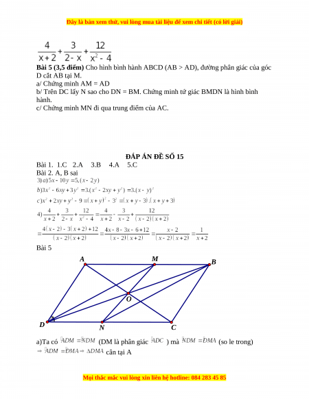 c/ Chứng minh MN đi qua trung điểm của AC. ĐÁP ÁN ĐỀ SỐ 15 Bài 1. 1.C 2.A 3.B 4.A 5.C Bài 2. A, B sai Bài 5 A M B O D N C a)Ta có (DM là phân giác ) mà (so le trong) cân tại A