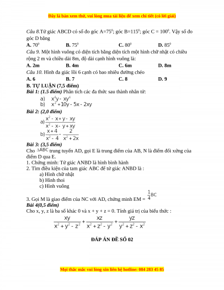Câu 8.Tứ giác ABCD có số đo góc A=750; góc B=1150; góc C = 1000. Vậy số đo góc D bằng A. 700 B. 750 C. 800 D. 850