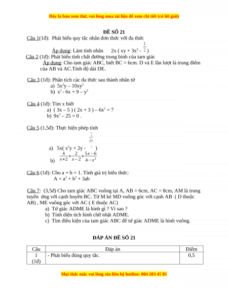 c) Tìm điều kiện của tam giác ABC để tứ giác ADME là hình vuông. ĐÁP ÁN ĐỀ SỐ 21 Câu Đáp án Điểm 1