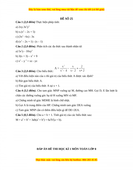 ĐÁP ÁN ĐỀ THI HỌC KÌ 1 MÔN TOÁN LỚP 8