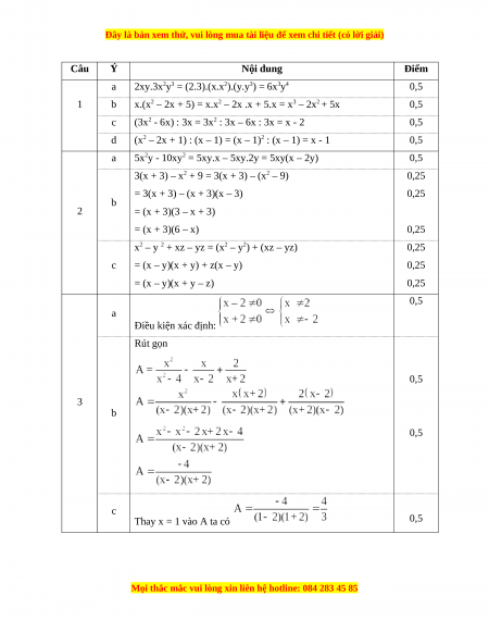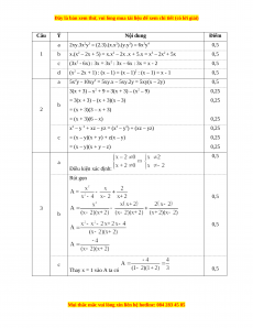 = (x – y)(x + y) + z(x – y) 0,25 = (x – y)(x + y – z) 0,25 0,5 a Điều kiện xác định: Rút gọn 0,5 3 b 0,5 c Thay x = 1 vào A ta có 0,5