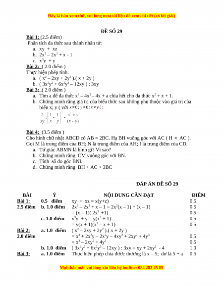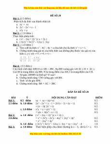 d. Chứng minh rằng BH + AC > 3BC ĐÁP ÁN ĐỀ SỐ 29 BÀI Ý NỘI DUNG CẦN ĐẠT ĐIỂM Bài 1: 0.5 điểm xy + xz = x(y+z) 0.5