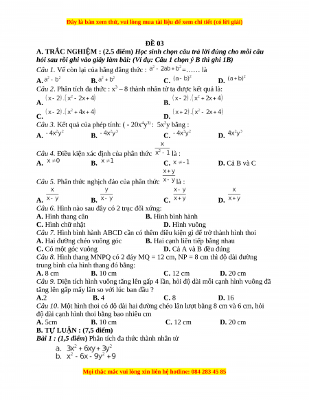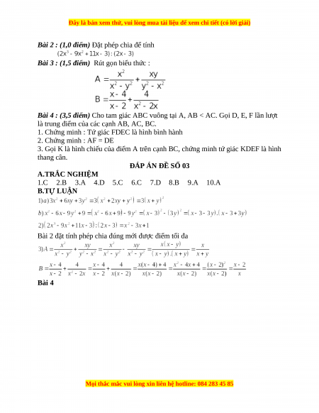 3. Gọi K là hình chiếu của điểm A trên cạnh BC, chứng minh tứ giác KDEF là hình thang cân. ĐÁP ÁN ĐỀ SỐ 03 A.TRẮC NGHIỆM 1.C 2.B 3.A 4.D 5.C 6.C 7.D 8.B 9.A 10.A B.TỰ LUẬN