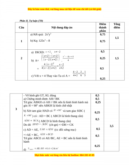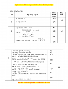 Phần II. Tự luận (7Đ) Điểm Tổng Câu Nội dung đáp án thành điểm phần a) Kết quả: 2x5y3 0,75 1,5 1 b) Kq: 125x3 – 8 0,75 a) ĐKXĐ: , x≠−2 0,5 2 ((x+2)−(x+2)) 0,25 1,5 b) A= ( x−2)( x +2) . 4 . 2 (x −2) x−2 =