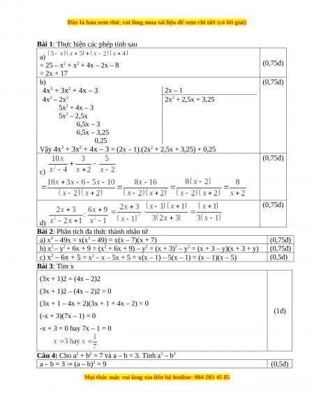 = 25 – x2 + x2 + 4x – 2x – 8 (0,75đ) = 2x + 17 b) (0,75đ) 4x3 + 3x2 + 4x – 3 2x – 1 4x2 – 2x2 2x2 + 2,5x + 3,25 5x2 + 4x – 3 5x2 – 2,5x 6,5x – 3 6,5x – 3,25 0,25