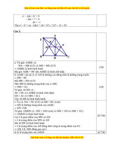 Vậy a3 – b3 = (a – b)(a2 + ab + b2) = 3.(7 – 1) = 24 Câu 5: A E K I N M B H C a/ Tứ giác AHBE có: MA = MB (GT) và MH = ME (GT) (1đ) AHBE là hình bình hành