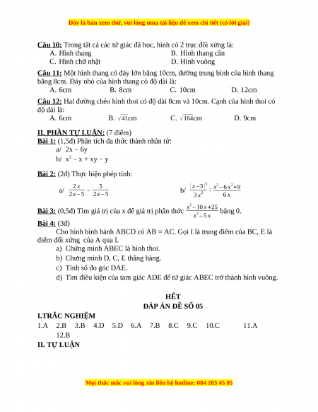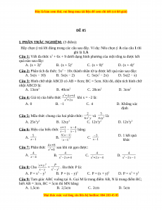 d) Tìm điều kiện của tam giác ADE để tứ giác ABEC trở thành hình vuông. HẾT ĐÁP ÁN ĐỀ SỐ 05 I.TRẮC NGHIỆM 1.A 2.B 3.B 4.D 5.D 6.A 7.B 8.C 9.C 10.C 11.A 12.B II. TỰ LUẬN