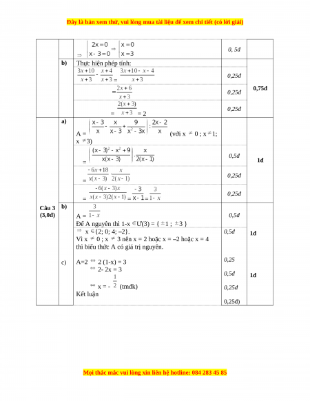 0, 5đ b) Thực hiện phép tính: 0,25đ = 0,75đ 0,25đ 0,25đ = = 2 a) A = (với x 0 ; x 1; x 3) 0,5đ 1đ = 0,25đ = 0,25đ = = = Câu 3 b) (3,0đ) A = 0,5đ