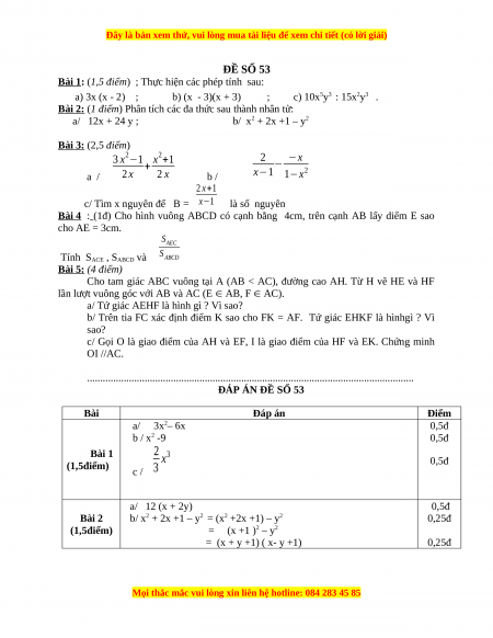 ............................................................................................................................. ĐÁP ÁN ĐỀ SỐ 53 Bài Đáp án Điểm a/ 3x2– 6x 0,5đ b / x2 -9 0,5đ Bài 1 2 x3 (1,5điểm) 0,5đ c / 3 a/ 12 (x + 2y) 0,5đ Bài 2