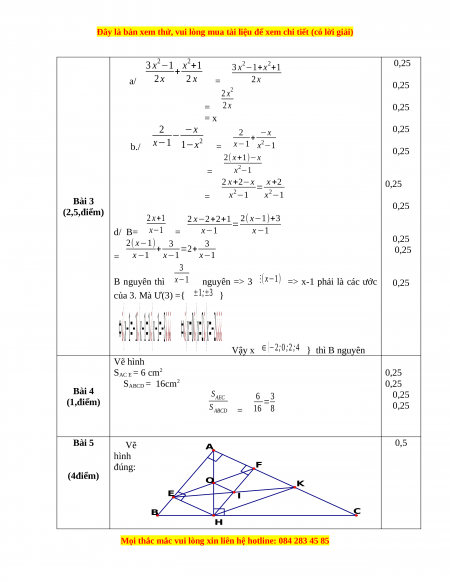 ⇔¿{x−1= ¿{x−1=¿{x−1=3¿ ⇔¿{x=0¿{x=2¿{x=−2¿ Vậy x ∈{−2;0;2;4 } thì B nguyên Vẽ hình SAC E = 6 cm2 0,25 S 0,25 Bài 4 ABCD = 16cm2 S 6 3 0,25 (1,điểm) AEC = S 0,25 ABCD = 16 8 Bài 5 Vẽ 0,5 A hình đúng: F (4điểm) O K E I B C H