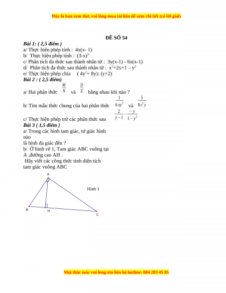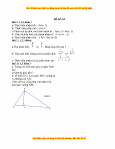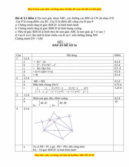 d/ Gọi E và G lần lượt là hình chiếu của B và C trên đường thẳng MN Chứng minh EN = GM HẾT ĐÁP ÁN ĐỀ SỐ 54 Câu Nội dung Điểm 1 2,5 đ a = 4x2 - - 4x 0.5 đ b = 27 - 27x+9x2 – x3 0.5 đ c = 3(x-1)(y-2x) 0.5 đ d = (x+1-y)(x+1+y) 0.5 đ e = 4y 0.5 đ 2 2,5 đ a ME = ND 0.5 đ b Mẫu thức chung 24x2y2 0.75 đ c 2 − y 2( y+1)− y 2 y+2− y y+2 1,25 đ − = = =