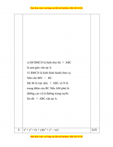 b) = 3x3 + 4x2y – 3x2y – 4xy2 0,5 = 3x2 + x2y – 4xy2. 0,25 3 a) 2(x – 3) 0,75 b) = (x2 + 4x + 4) – y2 0,25 = (x + 2)2 – y2 0,25 = (x + 2 + y)( x + 2 – y) 0,25 c) = x2 + 3x – 4x – 12 0,25 = x(x + 3) – 4(x + 3) 0,25 = (x + 3)(x – 4) 0,25 4 9x 0,5 =x a) = 9 b)
