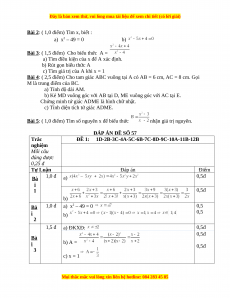 ĐỀ 1: 1D-2B-3C-4A-5C-6B-7C-8D-9C-10A-11B-12B nghiệm Mỗi câu đúng được 0,25 đ Tự Luận Đáp án Điểm Bà 1,0 đ a) 0,5đ i 1 0,5đ b) Bà 1,0 đ a) x2 – 49 = 0 0,5 i 0,5 b) 2 1,5 đ a) ĐKXĐ: 0,5đ 0,5đ Bà i b) A = 0,5đ 3 c) x = 1