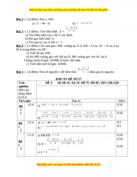 Bài 5: ( 1,0 điểm) Tìm số nguyên x để biểu thức nhận giá trị nguyên. ĐÁP ÁN ĐỀ SỐ 57 Trắc