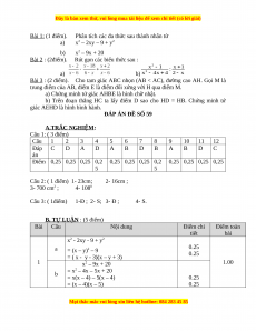 B. TỰ LUẬN : (5 điểm) Bài Câu Nội dung Điểm chi Điểm toàn tiết bài x2 - 2xy - 9 + y2 a 0.25 = (x – y)2 – 9 0.25 = ( x - y - 3)(x – y + 3) 1 1.00 x2 – 9x + 20 = x2 – 4x – 5x + 20 b = x(x – 4) – 5(x – 4) 0.25 = (x – 4)(x – 5) 0.25
