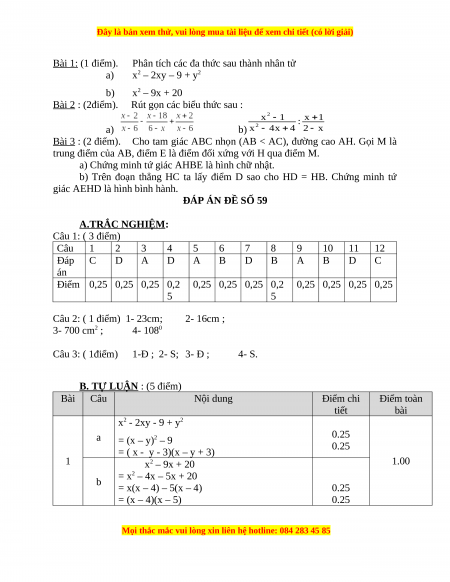 giác AEHD là hình bình hành. ĐÁP ÁN ĐỀ SỐ 59 A.TRẮC NGHIỆM: Câu 1: ( 3 điểm) Câu 1 2 3 4 5 6 7 8 9 10 11 12 Đáp C D A D A B D B A B D C án Điểm 0,25 0,25 0,25 0,2 0,25 0,25 0,25 0,2 0,25 0,25 0,25 0,25 5 5