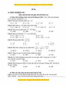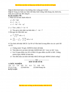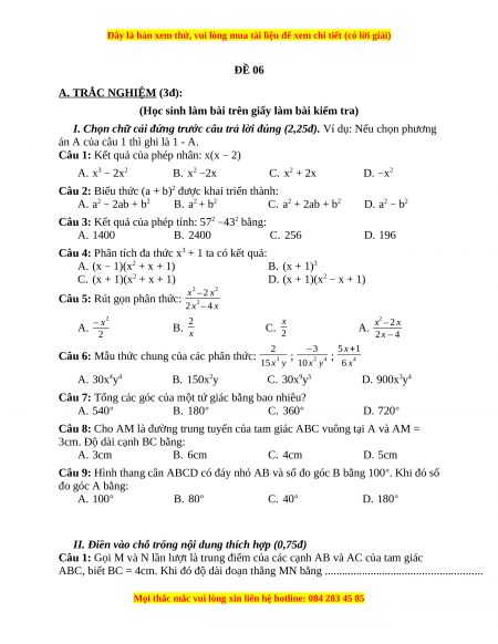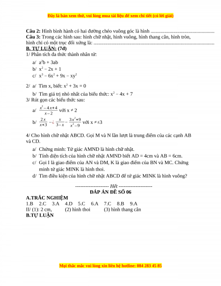 -------------------- Hết -------------------- ĐÁP ÁN ĐỀ SỐ 06 A.TRẮC NGHIỆM 1.B 2.C 3.A 4.D 5.C 6.A 7.C 8.B 9.A II/ (1): 2 cm, (2) hình thoi (3) hình thang cân B.TỰ LUẬN