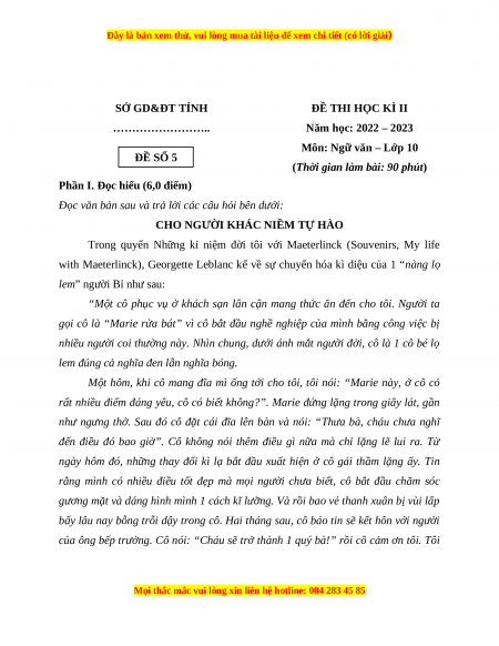 Môn: Ngữ văn – Lớp 10 ĐỀ SỐ 5