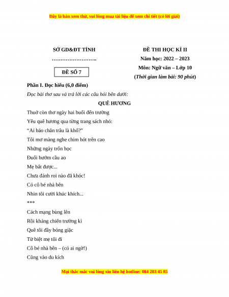 Môn: Ngữ văn – Lớp 10 ĐỀ SỐ 7