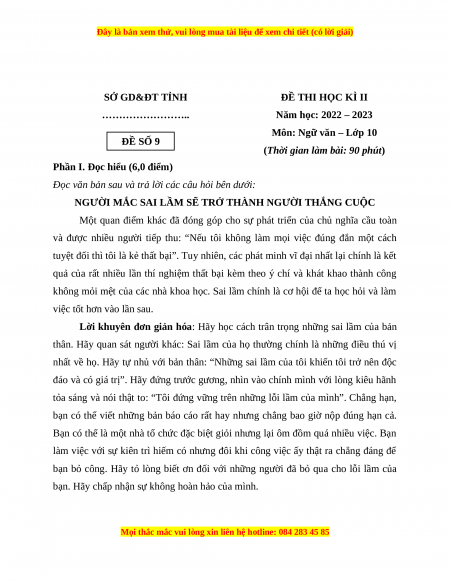 Môn: Ngữ văn – Lớp 10 ĐỀ SỐ 9