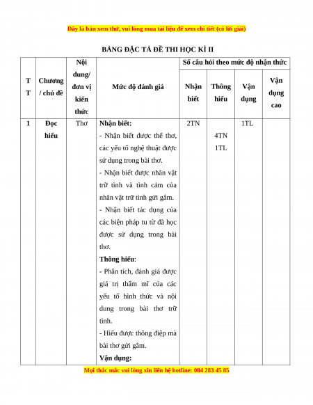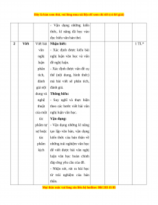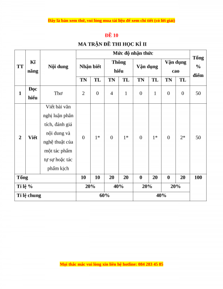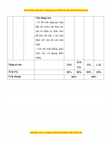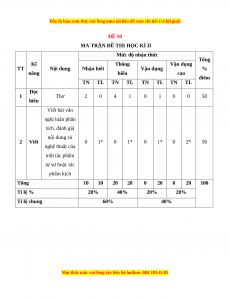 Mức độ nhận thức Tổng Kĩ Thông Vận dụng TT Nội dung Nhận biết Vận dụng % năng hiểu cao điểm TN TL TN TL TN TL TN TL Đọc 1 Thơ 2 0 4 1 0 1 0 0 50 hiểu Viết bài văn nghị luận phân tích, đánh giá nội dung và 2 Viết 0 1* 0 1* 0 1* 0 2* 50 nghệ thuật của một tác phẩm tự sự hoặc tác phẩm kịch Tổng 10 10 20 20 0 20 0 20 100 Tỉ lệ % 20% 40% 20% 20% Tỉ lệ chung 60% 40%