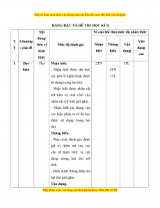 Số câu hỏi theo mức độ nhận thức dung/ T Chương Vận đơn vị Mức độ đánh giá Nhận Thông Vận T / chủ đề dụng kiến biết hiểu dụng cao thức 1 Đọc Thơ Nhận biết: 2TN 1TL hiểu