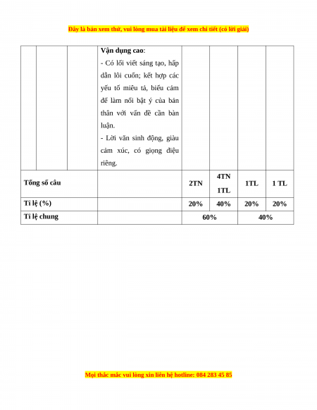 cảm xúc, có giọng điệu riêng. 4TN Tổng số câu 2TN 1TL 1 TL 1TL Tỉ lệ (%) 20% 40% 20% 20% Tỉ lệ chung 60% 40%