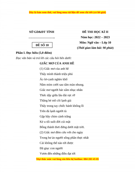 Môn: Ngữ văn – Lớp 10 ĐỀ SỐ 10