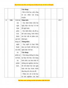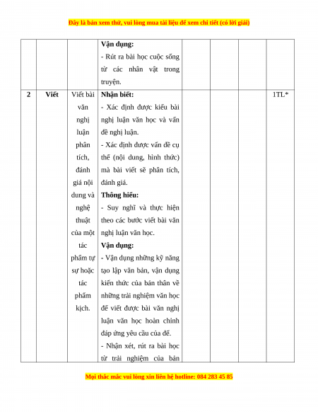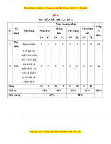 Mức độ nhận thức Tổng Kĩ Thông Vận dụng TT Nội dung Nhận biết Vận dụng % năng hiểu cao điểm TN TL TN TL TN TL TN TL Đọc 1 Truyện ngắn 3 0 5 0 0 2 0 0 60 hiểu Viết bài văn nghị luận phân tích, đánh giá nội dung và 2 Viết 0 1* 0 1* 0 1* 0 1* 40 nghệ thuật của một tác phẩm tự sự hoặc tác phẩm kịch Tổng 15 5 25 15 0 30 0 10 Tỉ lệ % 20% 40% 30% 10% 100% Tỉ lệ chung 60% 40%