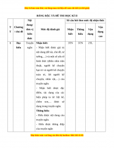 Số câu hỏi theo mức độ nhận thức dung/ T Chương Vận đơn vị Mức độ đánh giá Nhận Thông Vận T / chủ đề dụng kiến biết hiểu dụng cao thức 1 Đọc Truyện Nhận biết: 3TN 5TN 2TL hiểu ngắn