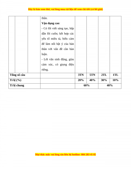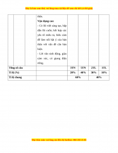 cảm xúc, có giọng điệu riêng. Tổng số câu 3TN 5TN 2TL 1TL Tỉ lệ (%) 20% 40% 30% 10% Tỉ lệ chung 60% 40%