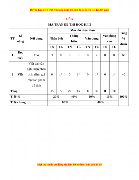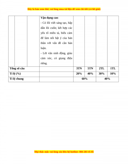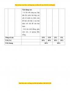 cảm xúc, có giọng điệu riêng. Tổng số câu 3TN 5TN 2TL 1TL Tỉ lệ (%) 20% 40% 30% 10% Tỉ lệ chung 60% 40%