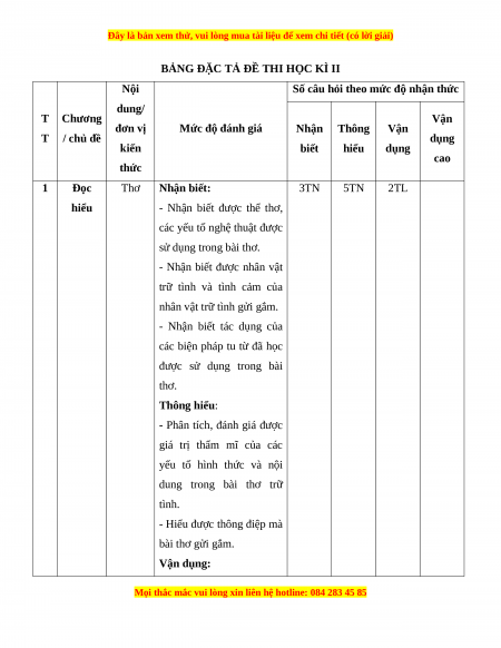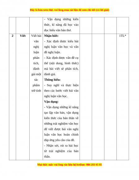 Mức độ nhận thức Tổng Kĩ Thông Vận dụng TT Nội dung Nhận biết Vận dụng % năng hiểu cao điểm TN TL TN TL TN TL TN TL Đọc 1 Thơ 3 0 5 0 0 2 0 0 60 hiểu Viết bài văn nghị luận phân 2 Viết tích, đánh giá 0 1* 0 1* 0 1* 0 1* 40 một tác phẩm trữ tình Tổng 15 5 25 15 0 30 0 10 Tỉ lệ % 20% 40% 30% 10% 100% Tỉ lệ chung 60% 40%