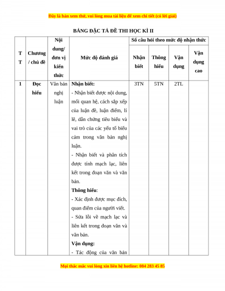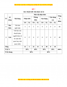 Mức độ nhận thức Tổng Kĩ Thông Vận dụng TT Nội dung Nhận biết Vận dụng % năng hiểu cao điểm TN TL TN TL TN TL TN TL Đọc Văn bản 1 3 0 5 0 0 2 0 0 60 hiểu nghị luận Viết bài văn thuyết phục người khác từ 2 Viết 0 1* 0 1* 0 1* 0 1* 40 bỏ một thói quen hay một quan niệm Tổng 15 5 25 15 0 30 0 10 Tỉ lệ % 20% 40% 30% 10% 100% Tỉ lệ chung 60% 40%