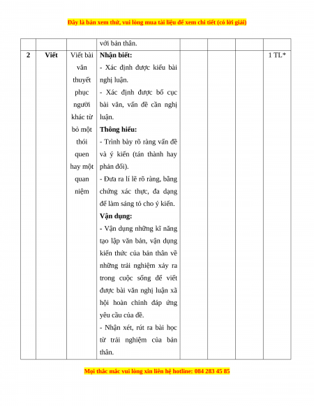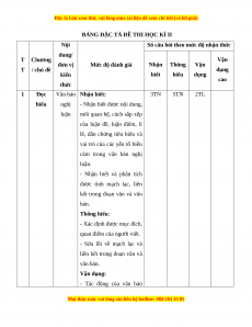 Mức độ nhận thức Tổng Kĩ Thông Vận dụng TT Nội dung Nhận biết Vận dụng % năng hiểu cao điểm TN TL TN TL TN TL TN TL Đọc Văn bản 1 3 0 5 0 0 2 0 0 60 hiểu nghị luận Viết bài văn thuyết phục người khác từ 2 Viết 0 1* 0 1* 0 1* 0 1* 40 bỏ một thói quen hay một quan niệm Tổng 15 5 25 15 0 30 0 10 Tỉ lệ % 20% 40% 30% 10% 100% Tỉ lệ chung 60% 40%