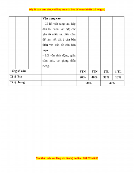 cảm xúc, có giọng điệu riêng. Tổng số câu 3TN 5TN 2TL 1 TL Tỉ lệ (%) 20% 40% 30% 10% Tỉ lệ chung 60% 40%