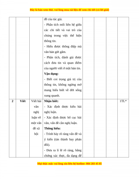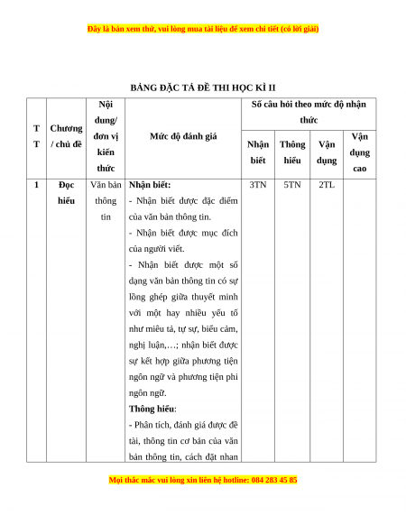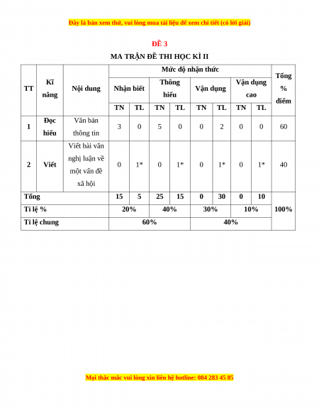 Mức độ nhận thức Tổng Kĩ Thông Vận dụng TT Nội dung Nhận biết Vận dụng % năng hiểu cao điểm TN TL TN TL TN TL TN TL Đọc Văn bản 1 3 0 5 0 0 2 0 0 60 hiểu thông tin Viết bài văn nghị luận về 2 Viết 0 1* 0 1* 0 1* 0 1* 40 một vấn đề xã hội Tổng 15 5 25 15 0 30 0 10 Tỉ lệ % 20% 40% 30% 10% 100% Tỉ lệ chung 60% 40%