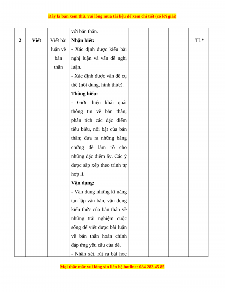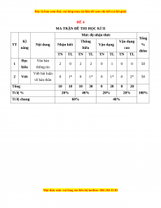 Mức độ nhận thức Tổng Kĩ Thông Vận dụng TT Nội dung Nhận biết Vận dụng % năng hiểu cao điểm TN TL TN TL TN TL TN TL Đọc Văn bản 1 2 0 2 2 0 1 0 0 50 hiểu thông tin Viết bài luận 2 Viết 0 1* 0 1* 0 1* 0 2* 50 về bản thân Tổng 10 10 10 30 0 20 0 20 Tỉ lệ % 20% 40% 20% 20% 100% Tỉ lệ chung 60% 40%