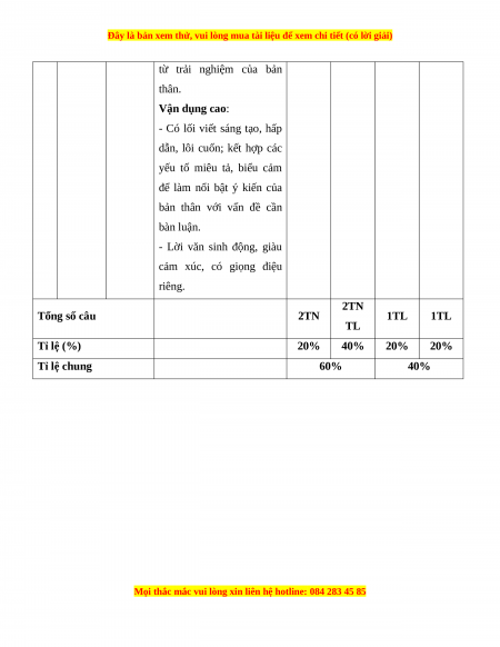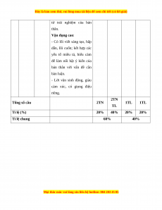 cảm xúc, có giọng điệu riêng. 2TN Tổng số câu 2TN 1TL 1TL TL Tỉ lệ (%) 20% 40% 20% 20% Tỉ lệ chung 60% 40%