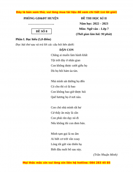 Môn: Ngữ văn – Lớp 7 ĐỀ SỐ 8