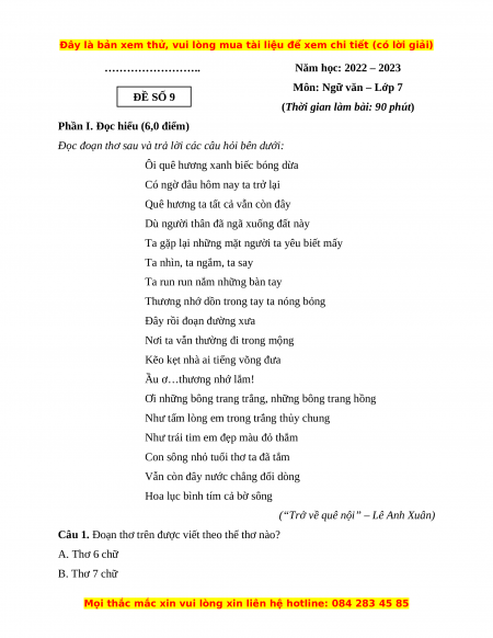 Môn: Ngữ văn – Lớp 7 ĐỀ SỐ 9